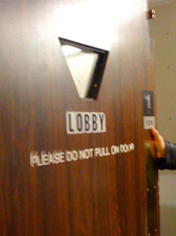 The Baroness is a "medical hotel" for family members of the ill and recovering patients needing to be close to the hospital. We found the obscure entrance to the hotel – sort of a low profile door entering into a little hall with vending machines. On the small manual elevator door was a notice about early morning jack hammering and roto hammering that would occur. The notice was kind enough to delineate both types of drilling.